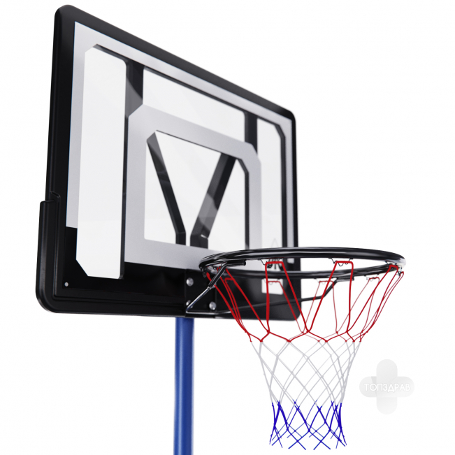 Размер щита составляет 110 x 72 см, а размер кольца — 45 см. Основание размером 90 x 60 x 15 см имеет объём 50 литров, что даёт возможность заполнить его водой или песком для устойчивости.